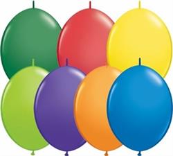 Our QuickLink latex balloons are 12 inches wide and sold in packs of 50. This assortment includes red, purple violet, green, dark blue, yellow, orange, and lime green.